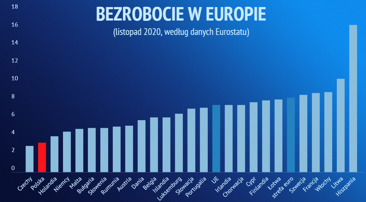 Według niedawno opublikowanych danych Eurostatu poziom bezrobocia w Polsce za listopad 2020 wynosi 3,2%, a sytuacja na rynku pracy wydaje się być stabilna.