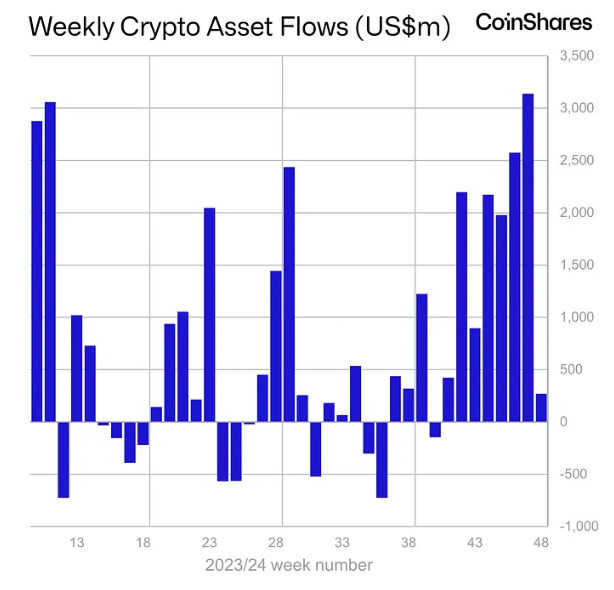 W zeszłym tygodniu napływy inwestycji w kryptowaluty gwałtownie spadły do 270 mln USD. Sygnalizuje to spowolnienie po kolejnych tygodniach silnej aktywności.