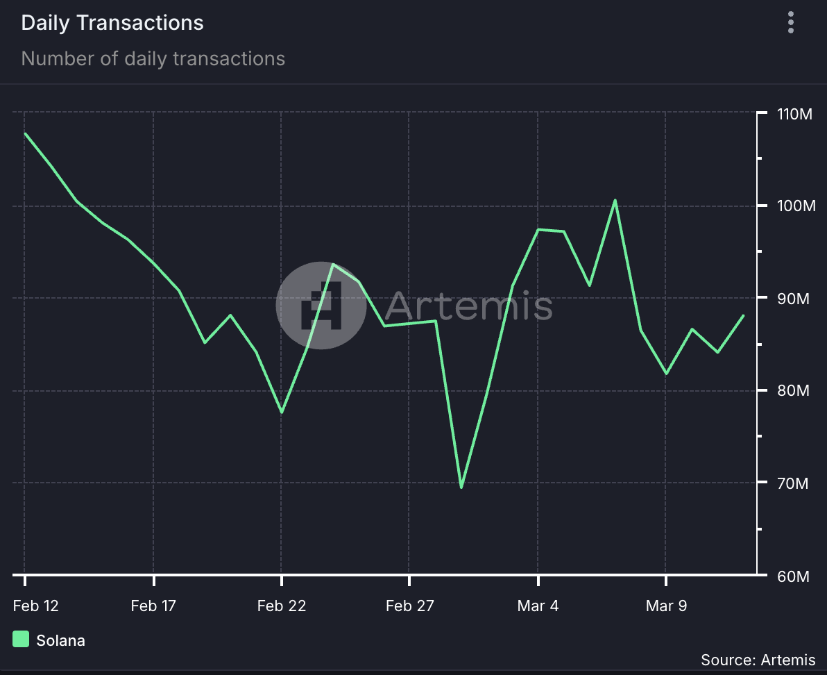 Co więcej, ten trend prowadzi do niższej aktywności transakcyjnej, co zaobserwowano w przypadku Solana. Według Artemis w okresie objętym analizą dzienna liczba transakcji w sieci zmniejszyła się o 18%.