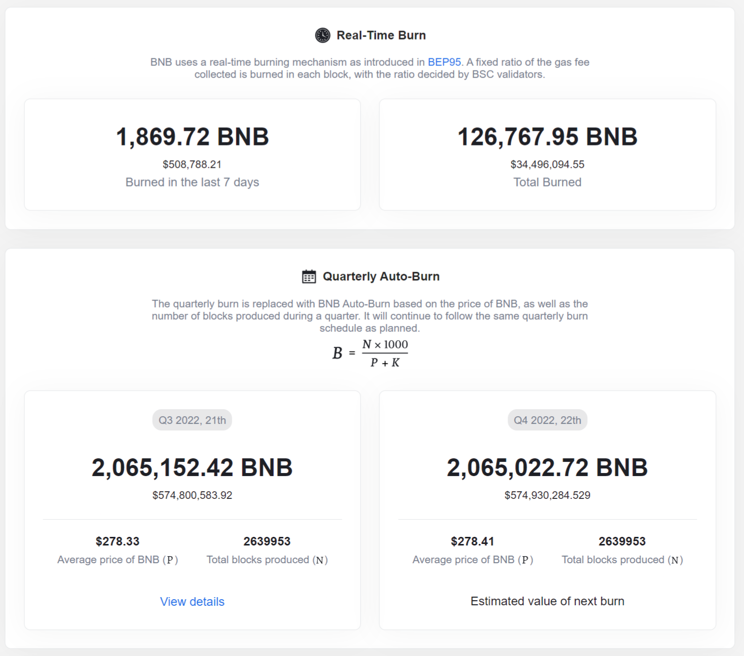 W ramach Binance Evolution Proposal 95 (BEP-95), wdrożonego w listopadzie 2021 roku, dodano do łańcucha BNB mechanizm wypalania w czasie rzeczywistym. Pozwala on smart kontraktowi na automatyczne spalanie części opłat za gaz zebranych przez walidatorów z każdego bloku (wytwarzanych średnio co 3 sekundy).
