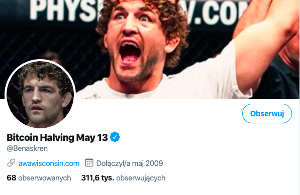 Posiadający na Twitterze ponad 300 tysięcy obserwujących Ben Asker jest znanym sympatykiem Bitcoina. W ostatnich dniach zmienił on swoją nazwę na popularnym portalu społecznościowym na “Bitcoin Halving May 13”.