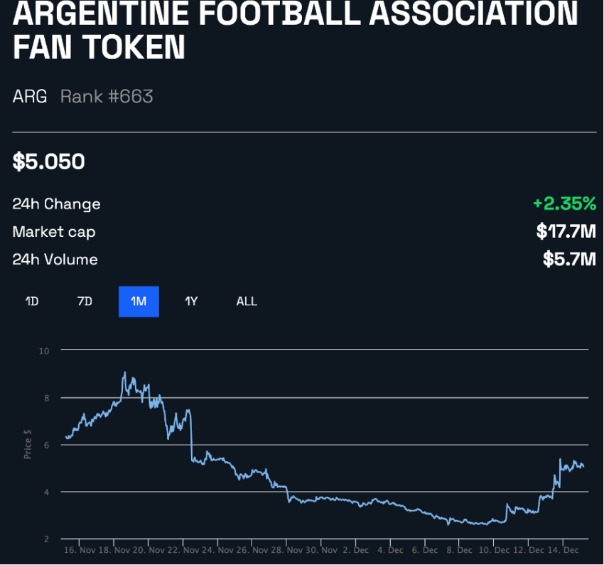 Po historycznym zwycięstwie Arabii Saudyjskiej nad Argentyną jej odpowiedni NFT zwiększył sprzedaż o 387%. Po drugiej stronie argentyński fan token ARG spadł o 21% po przegranej. ARG zdołał jednak odzyskać trochę wartości po awansie do finału po zwycięstwie z Chorwacją.