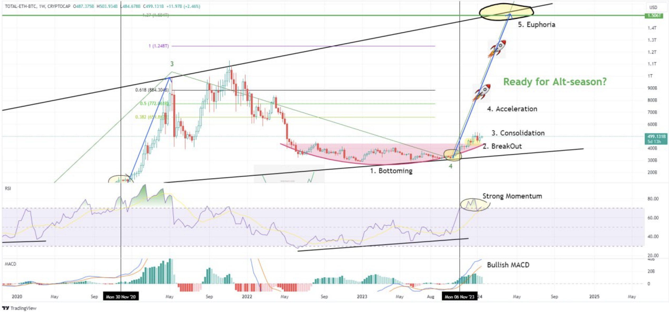 “To jest miejsce, w którym altcoin sezon wysyła kryptowaluty w kosmos. Rynek podwoi się i potroi w ciągu kilku tygodni lub miesięcy.”