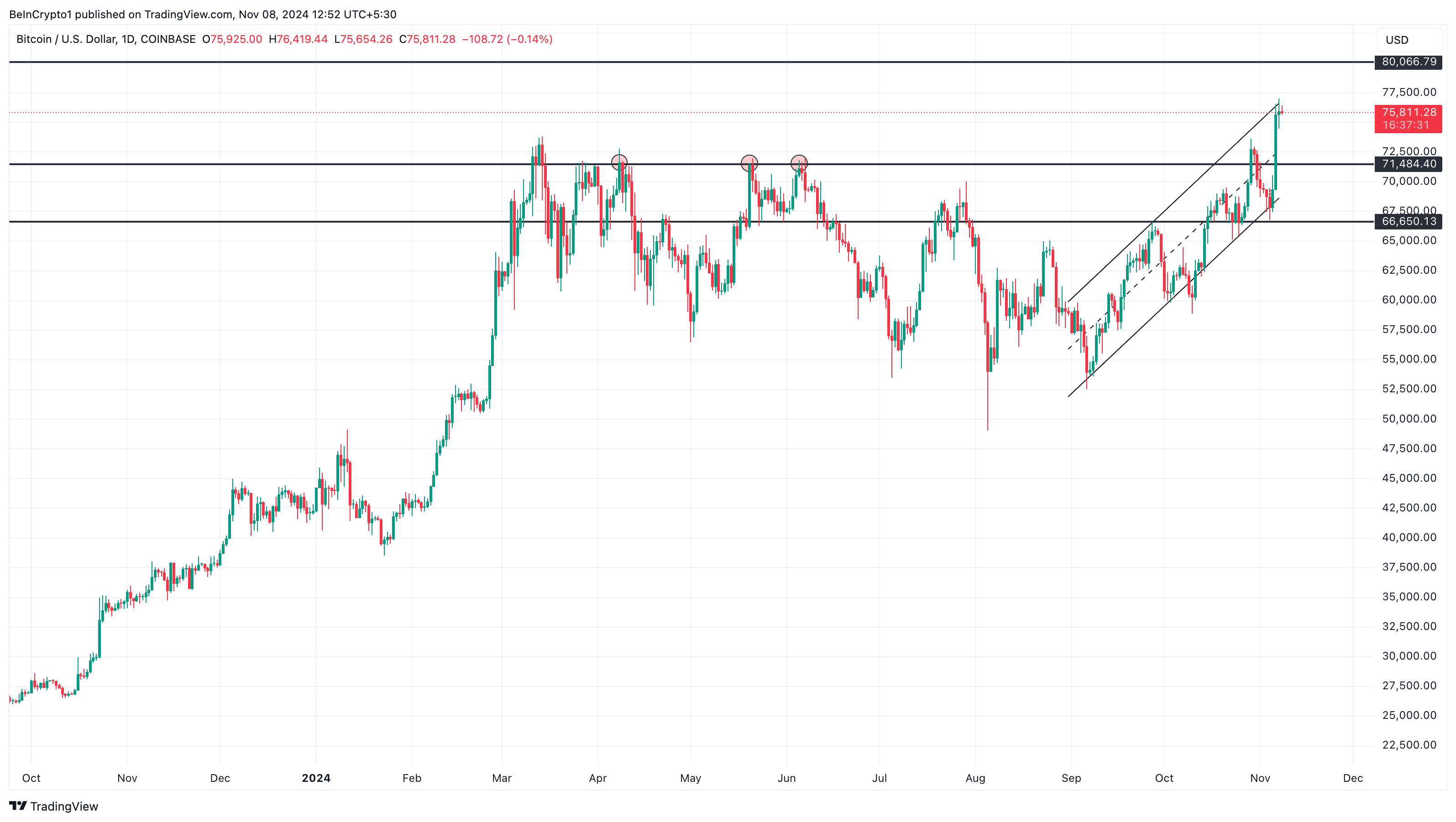 Oprócz tego, że spot Bitcoin ETFy biją rekordy, to jeszcze cena Bitcoina osiągnęła nowy rekord wszech czasów. Najpierw nastąpiło to tuż po zwycięstwie Trumpa w środę. Natomiast kilka godzin temu BTC wzrosło do 76 943 USD, zanim nieco spadło do 75 915 USD w chwili obecnej.