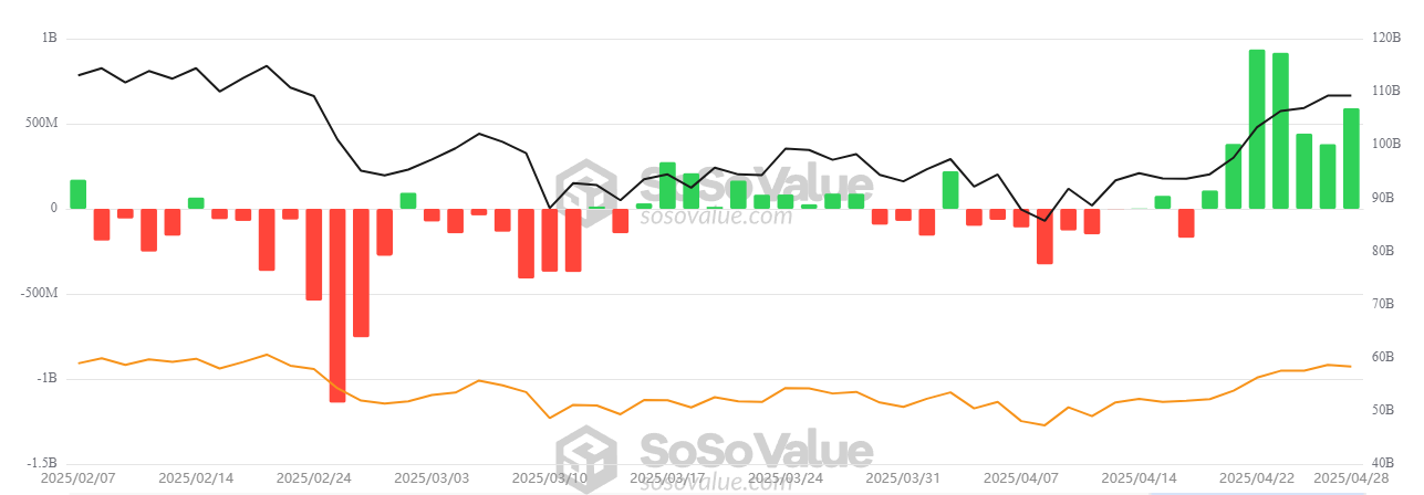Kolejny ważny punkt wspierający tezę Kaduny to wzrost napływów do ETF-ów na Bitcoin. BeInCrypto niedawno informowało, że spotowe ETF-y Bitcoina przyciągnęły nowe zapotrzebowanie inwestorów w poniedziałek. Zanotowały napływy netto w wysokości 591,29 mln USD i przedłużyły swoją zwycięską passę do siedmiu kolejnych dni.