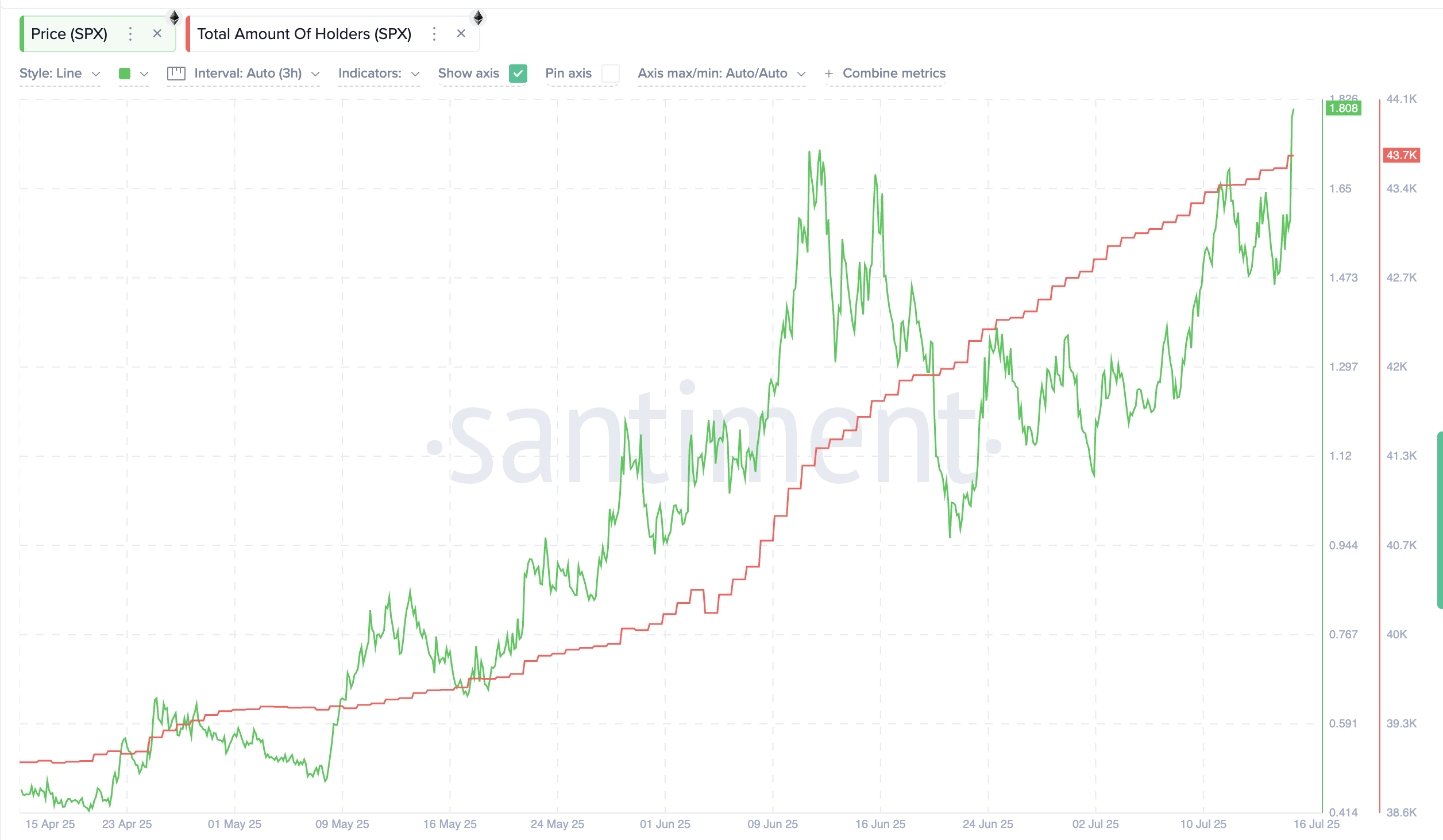 Co więcej, danez Santiment potwierdzają, że detaliści podążają za smart money. Liczba portfeli SPX przekroczyła teraz 43 700, w porównaniu do około 41 800 w połowie czerwca.