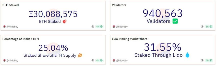 Lido pozyskało zrzut ekranu Dune Analytics, który twierdzi, że 25% podaży ETH jest obecnie stakowane. Według platformy stakowano już nieco ponad 30 milionów ETH. Lido jest liderem rynku z 31,5% udziałem w tej sumie.