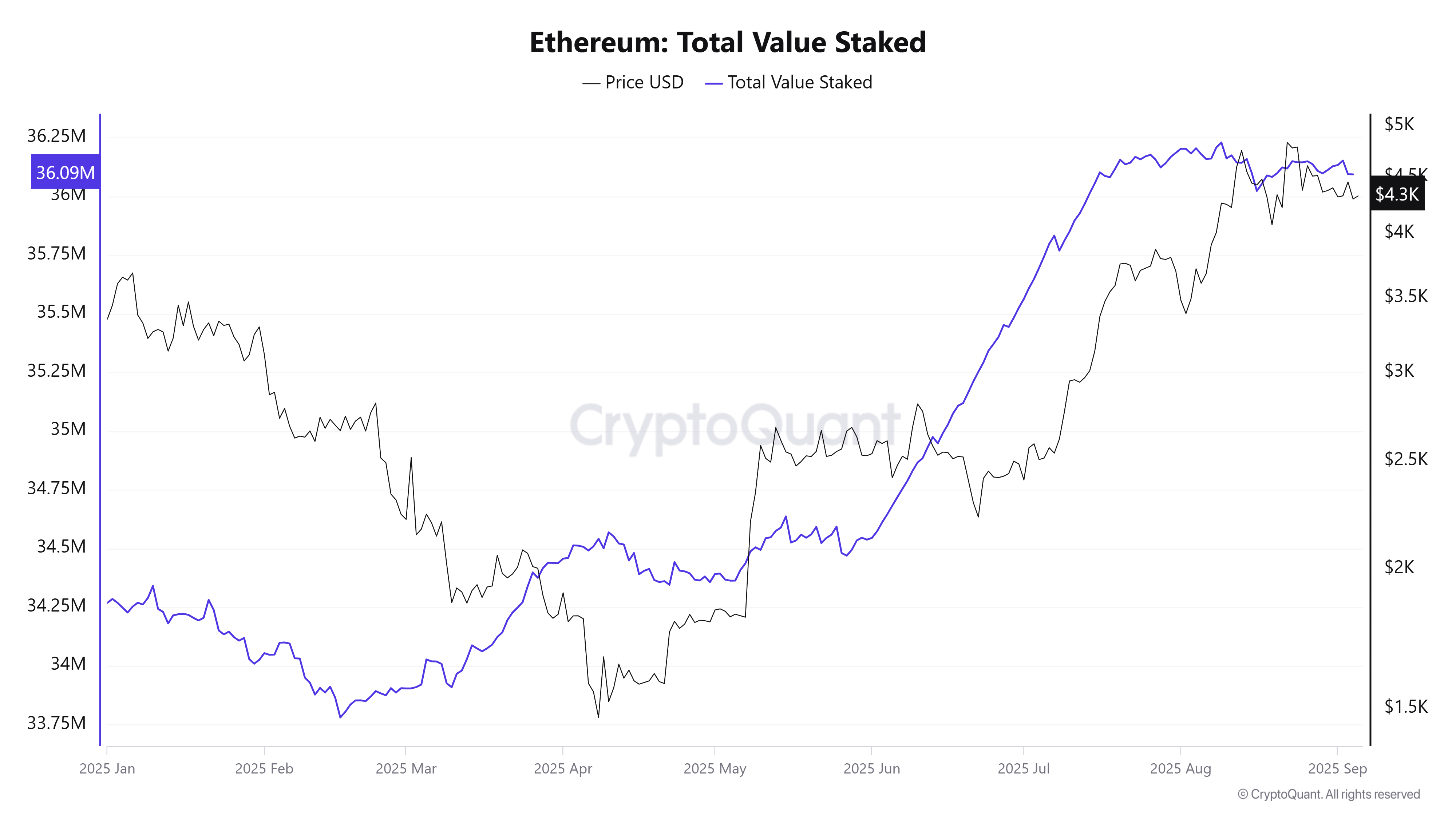Dane z CryptoQuant pokazują silny trend wzrostowy w stakowanym ETH od połowy 2025 roku. Całkowita liczba wzrosła z 34,5 mln ETH w maju do ponad 36 mln obecnie. Ta liczba prawdopodobnie wzrośnie dalej wraz z ETH obecnie czekającym w kolejce do stakingu.