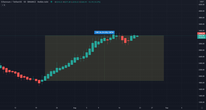 W ciągu ostatnich trzydziestu dni cena Ethereum odnotowała korzystny wzrost. Kryptowaluta wzrosła o prawie 75% od 22 lipca do 21 sierpnia. Ethereum poszybowało w górę z 1 800 dolarów do obecnej ceny 3 265 dolarów.