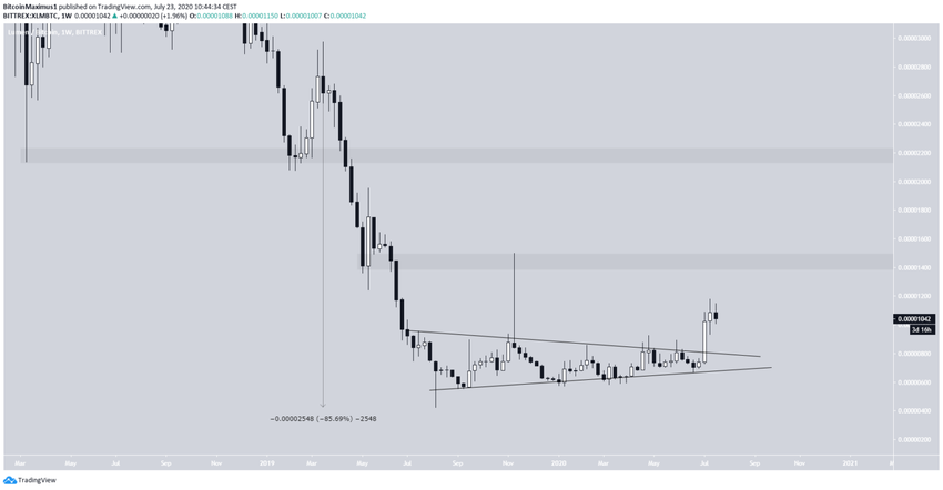 Cena XLM znajdowała się w spirali spadkowej od listopada 2018 roku, tracąc około 90% swojej wartości w kolejnym roku. Straty ostatecznie osiągnęły dno w sierpniu 2019 r., kiedy cena stworzyła długi dolny knot, który dotknął 433 satoshi.