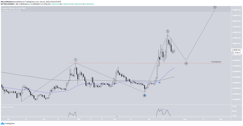 Wykres dzienny pokazuje, że XLM przyspiesza ruch w górę od dnia 27 czerwca. Wydaje się jednak, że trend wzrostowy mógł faktycznie rozpocząć się w maju. Cena wydaje się być obecnie w trzeciej fali, która mogła osiągnąć szczyt.