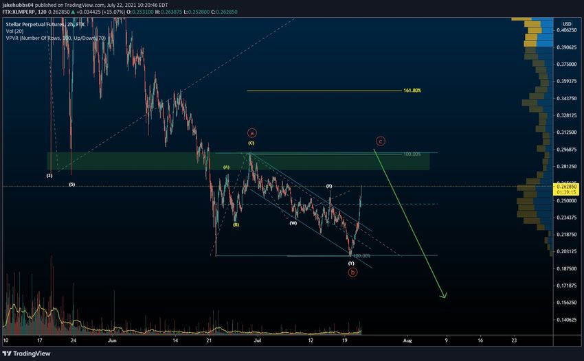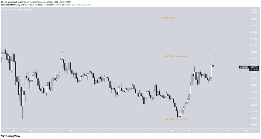 Jeśli ruch jest rzeczywiście płaską strukturą korekcyjną A-B-C, to Stellar powinien osiągnąć szczyt w pobliżu poziomu 0,292 USD. Dałoby to falom A:C stosunek 1:1.