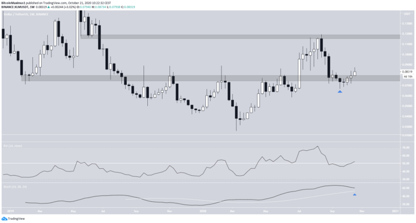 Wykres tygodniowy dla XLM pokazuje, że cena znajduje się powyżej 0,077 USD po zatwierdzeniu go jako wsparcia w ciągu ostatnich trzech tygodni. Obszar jest niezwykle ważny, ponieważ początkowo działał jako wsparcie na początku 2019 r., a następnie – we wrześniu tego samego roku – zamienił się w opór.