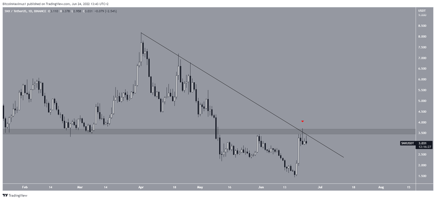 SNX od 1 kwietnia spada poniżej opadającej linii oporu. Ruch w dół doprowadził do najniższego poziomu 1,42 USD w dniu 18 czerwca.