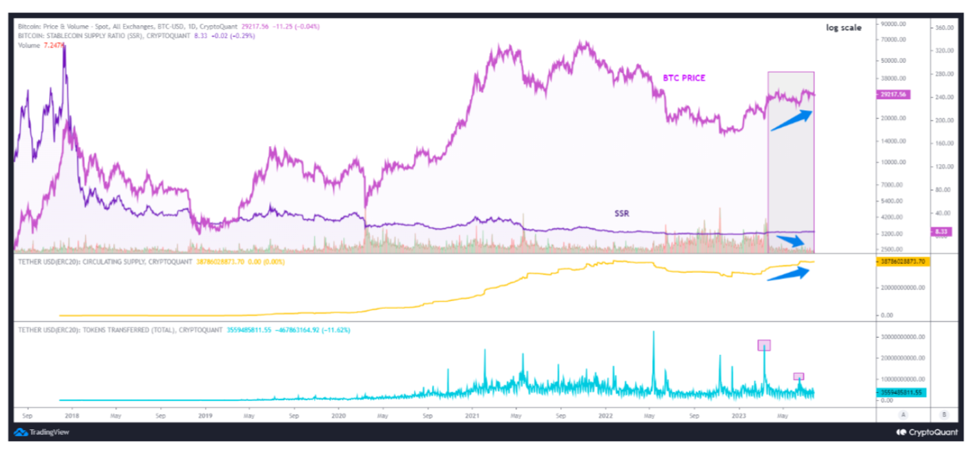 Obecnie otrzymujemy podobne bycze sygnały z tak zwanego wskaźnika podaży stablecoinów (SSR). Jest on obliczany poprzez podzielenie całkowitej wartości rynkowej Bitcoina przez całkowitą wartość rynkową stablecoinów.