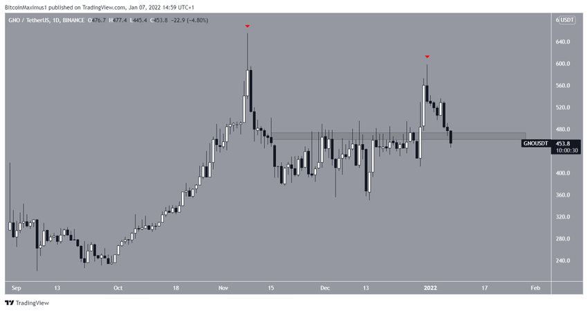GNO jest obecnie w trakcie spadania poniżej poziomu horyzontalnego 470 USD. Jeśli tak się stanie, może to znacznie przyspieszyć tempo spadku.