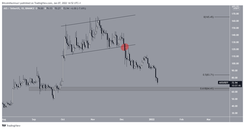 AXS spada od momentu przełamania z rosnącego kanału równoległego (czerwone kółko) 5 grudnia. Ruch w dół doprowadził do tej pory do dołka 70,27 USD osiągniętego 7 stycznia.