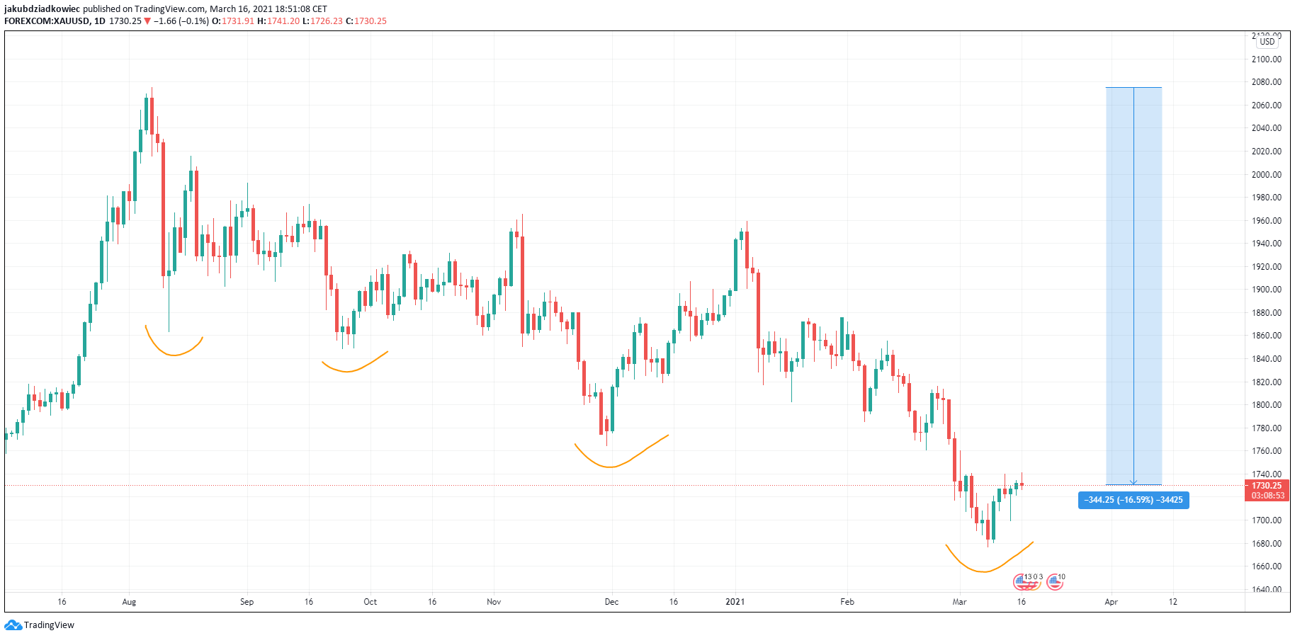 Aktualnie złoto wyceniane jest na 1730 USD za uncję. Od rekordu wszech czasów na poziomie 2075 USD, który został ustanowiony 7 sierpnia 2020 roku, cenny kruszec spadł o 16,5%. Pomimo trwającego od kilku miesięcy trendu spadkowego, powoli zaczynają się pojawiać krótkoterminowe sygnały odwrócenia. Nie są one jednak potwierdzone, a dzienny wykres złota niedawno ustanowił kolejny niższy dołek.