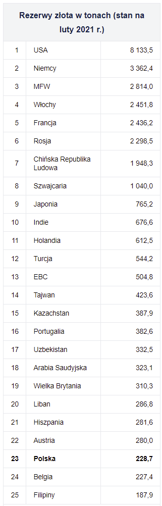 Polska w rankingu krajów posiadających najwięcej złota znajduje się w trzeciej dziesiątce. W latach 2018-19 awansowała z czwartej dziesiątki, gdyż rezerwy złotego kruszcu zostały powiększone o 126 ton. Według szacunków i przy założeniu, że inne kraje nie będą zwiększać swoich rezerw, zakup kolejnych 100 ton złota dałby nam miejsce w pierwszej dwudziestce.
