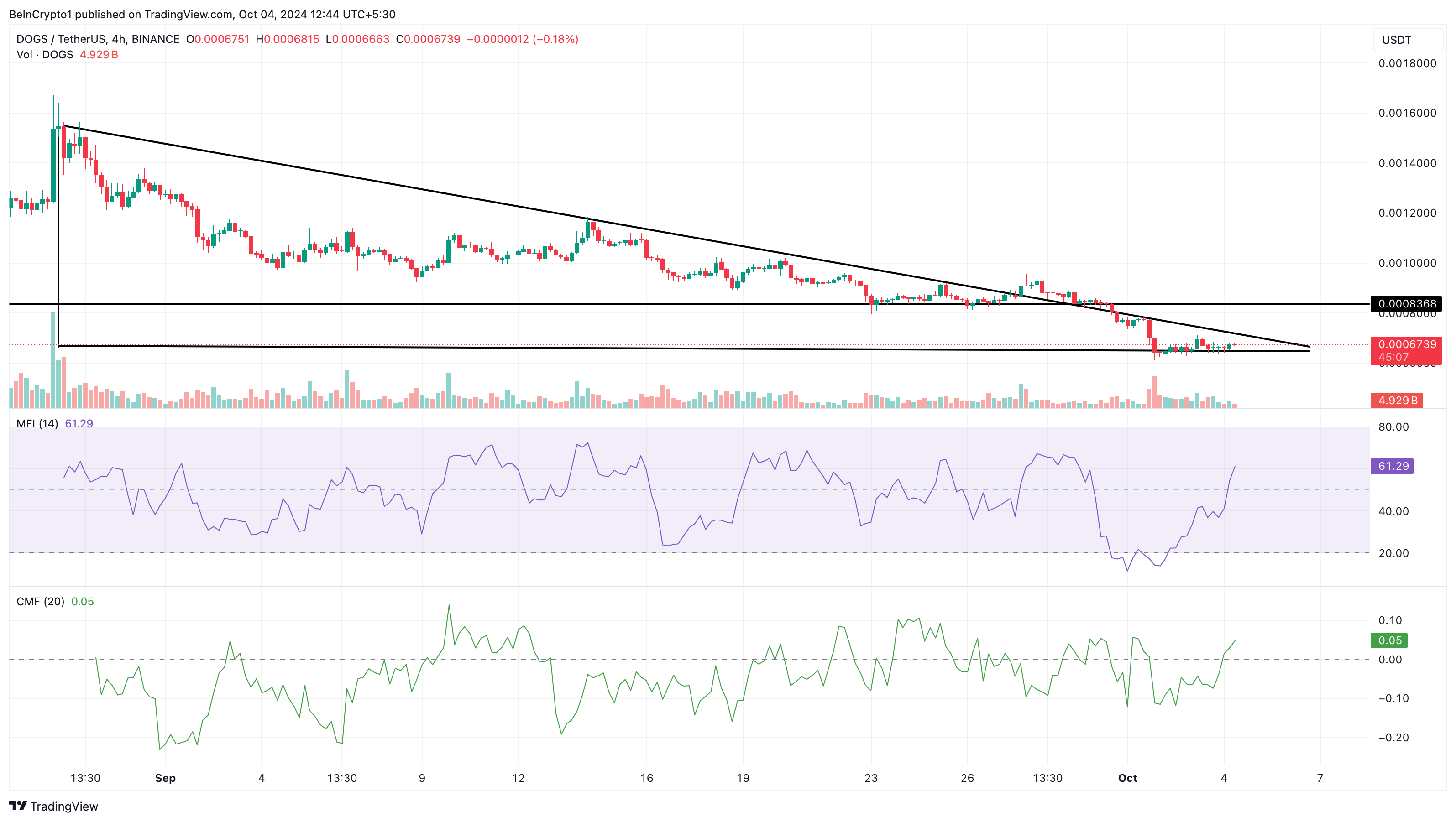 Analiza wykresu 4-godzinnego pokazuje, że cena DOGS może wkrótce się odbić. Dwa wskaźniki wspierające ten trend to chaikin money flow (CFM) i money flow index (MFI).