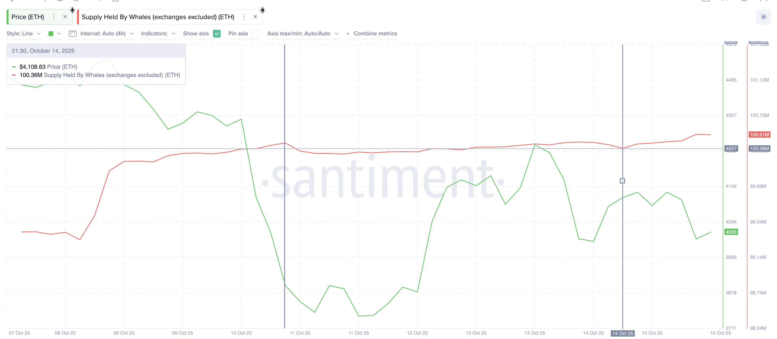 Wieloryby Ethereum — portfele posiadające duże ilości ETH — wydają się przygotowywać na to wcześniej. Dane on-chain pokazują, że te adresy zwiększyły swoje zasoby z 100,36 mln ETH, 14 października do 100,51 mln ETH, dwa dni później. To dodatek około 150 000 ETH, co odpowiada około 603 mln USD przy obecnych cenach ETH.