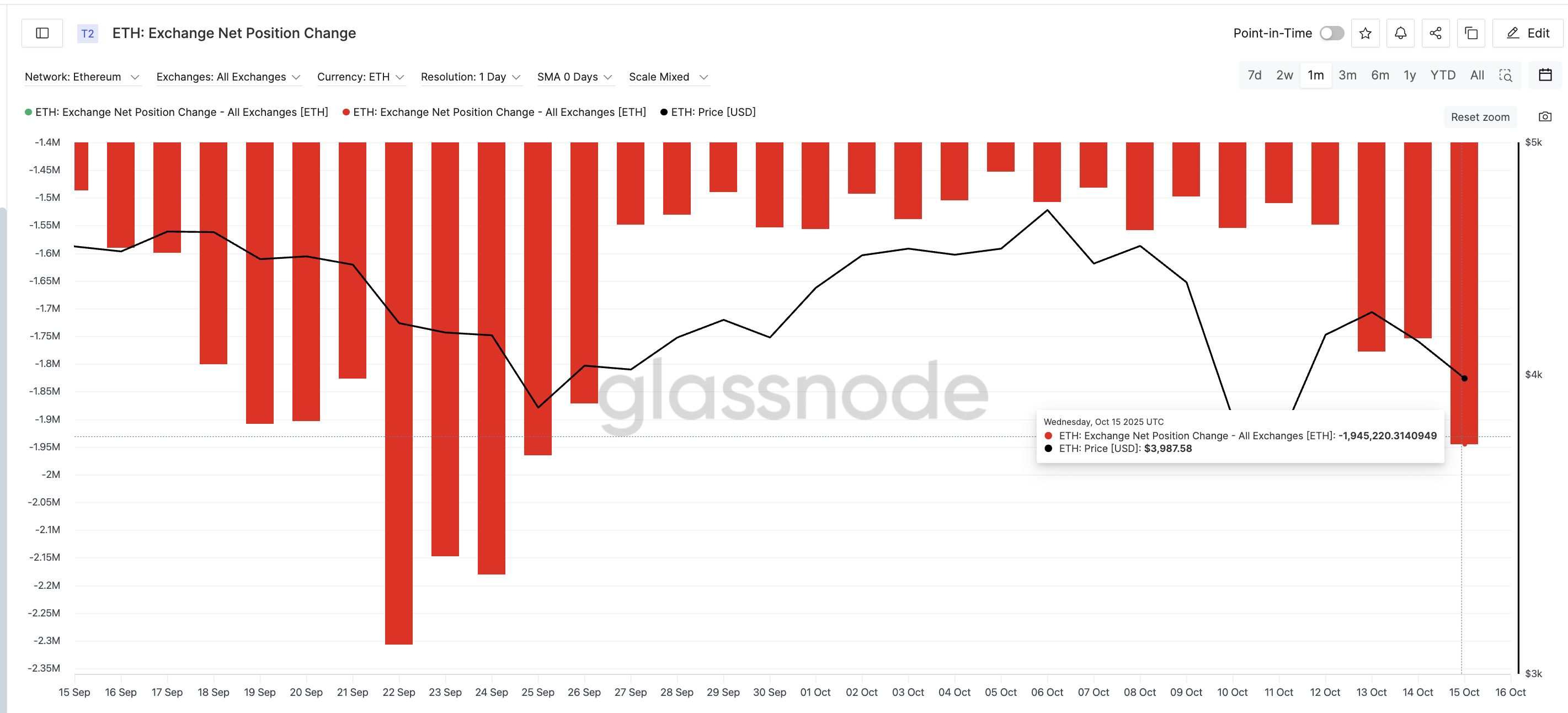 Jednocześnie zmiana pozycji netto na giełdzie, która śledzi, ile ETH przemieszcza się na giełdy lub z nich, pogłębiła się z –1,55 mln ETH, 10 października do –1,94 mln ETH, 15 października.