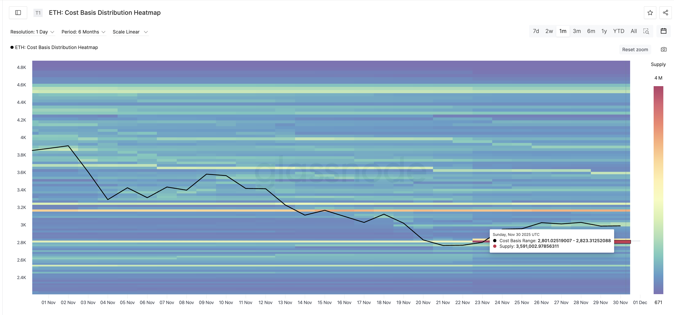 Kolejny krok to sprawdzenie, czy wykres ceny Ethereum wspiera te same wnioski. Mapa cieplna rozkładu kosztów pokazuje, gdzie ostatnio gromadzono duże skupiska ETH. Najsilniejsze pasmo mieści się między 2801 USD a 2823 USD, z 3591 002 ETH zakupionymi w tej strefie. To najsilniejsze wsparcie, jakie Ethereum teraz posiada.