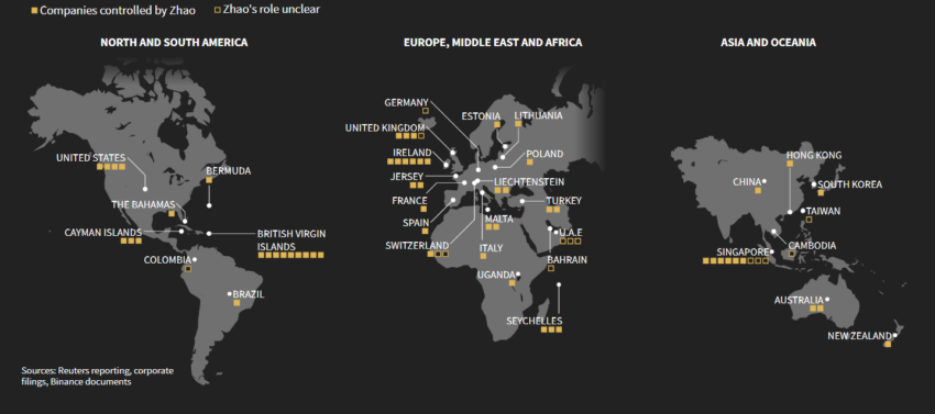 W sumie CZ posiada pakiet kontrolny w co najmniej 59 z 73 firm na całym świecie. Według Reutersa Zhao nadal ma firmę w Chinach, gdzie giełdy kryptowalut są oficjalnie zakazane. Większość nieprzejrzystych firm znajduje się w Zjednoczonych Emiratach Arabskich (trzy jednostki), gdzie rola CZ również jest niejasna. Publikacja nie zawierała danych o firmach na terenie Federacji Rosyjskiej, Ukrainy czy Białorusi.