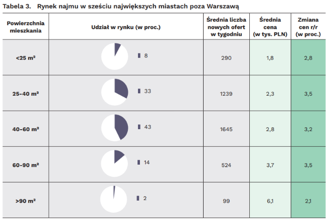 Badacze pod lupę wzięli również ceny najmu z podziałem na metraż mieszkań. W najpopularniejszym segmencie, czyli o wielkości 40-60 m², średnia cena najmu takiej nieruchomości to 2,8 tysięcy PLN poza Warszawą. W samej stolicy wartość ta wynosi 3,7 tysięcy PLN.