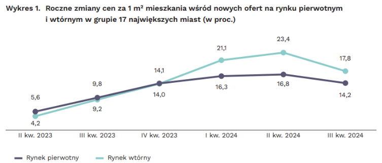 Z raportu opublikowanego 6 listopada przez Polski Instytut Ekonomiczny, możemy się dowiedzieć, że dynamika wzrostu cen mieszkań w Polsce hamuje. Wśród największych miast, w III kwartale tego roku, ceny sprzedaży mieszkań na rynku pierwotnym wzrosły w ujęciu rocznym o 14 proc. To o 3 p.p. mniej niż w poprzednim kwartale. Na rynku wtórnym wartość ta wynosi 18 proc. i jest to o 5,5 p.p. mniej niż w drugim kwartale tego roku.