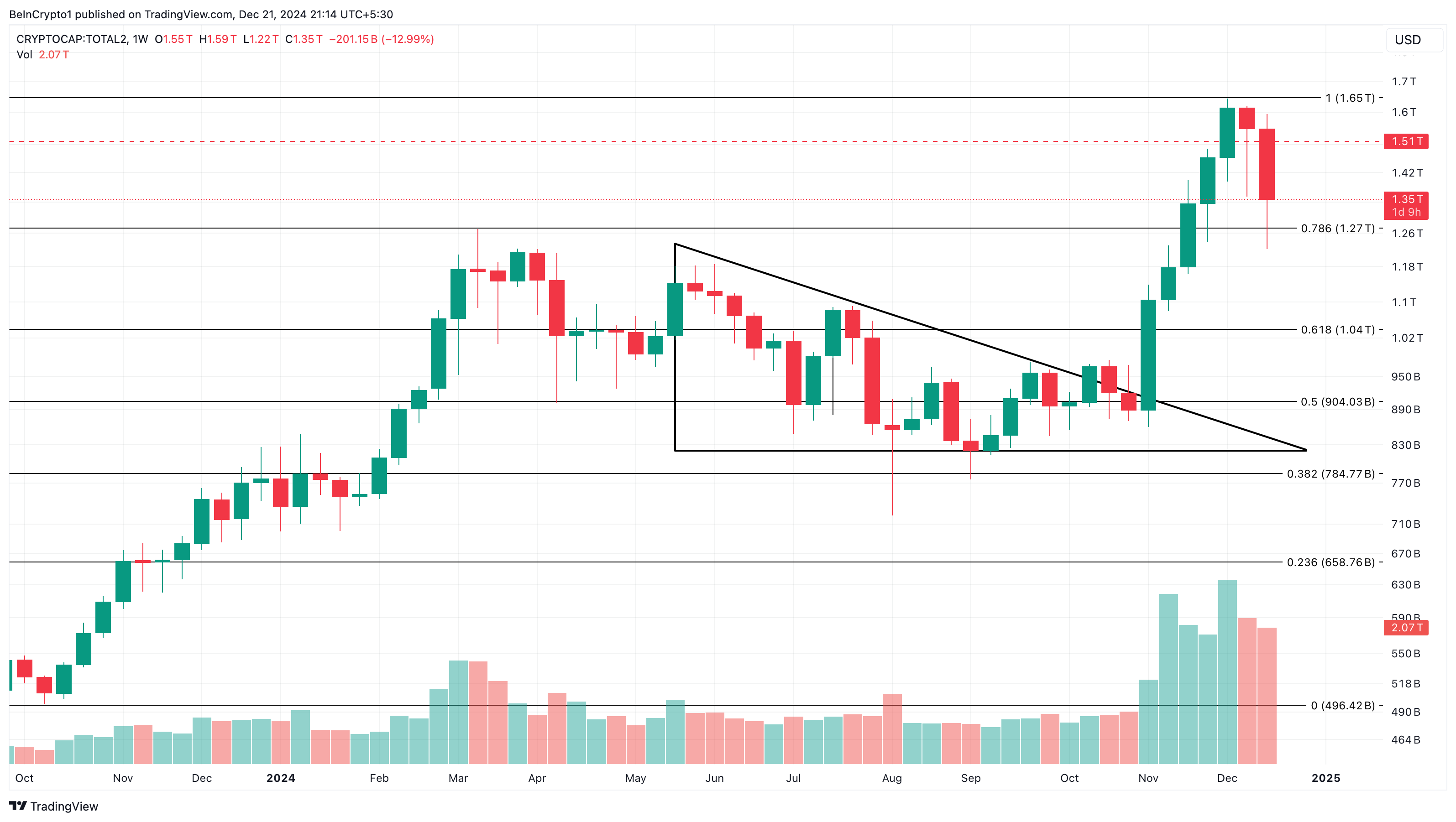 Jeśli ten wolumen wzrośnie, kapitalizacja rynkowa TOTAL2 może wzrosnąć do 1,65 bln USD, sygnalizując odrodzenie szans na sezon altcoinów i potencjalnie podnosząc ceny.