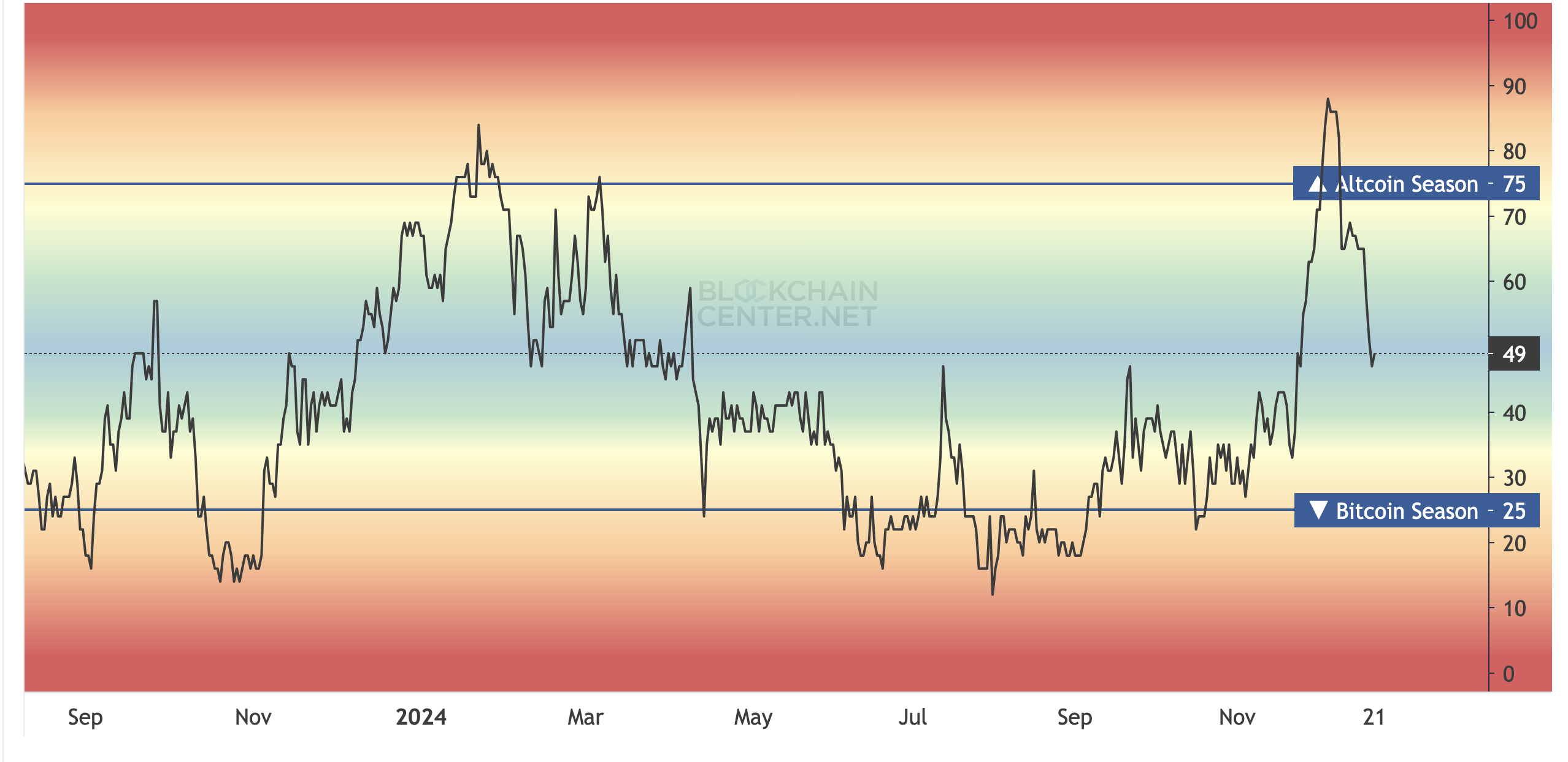Zazwyczaj wartość wskaźnika powyżej 75 sygnalizuje początek sezonu altcoinów, podczas gdy wartość 25 odzwierciedla dominację Bitcoina. Jednak obecnie wskaźnik spadł do 49, co podkreśla niepowodzenie altcoinów, gdy Bitcoin odzyskuje silniejszą pozycję na rynku.
