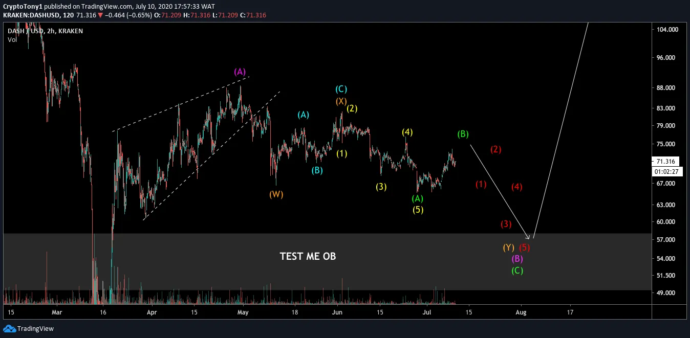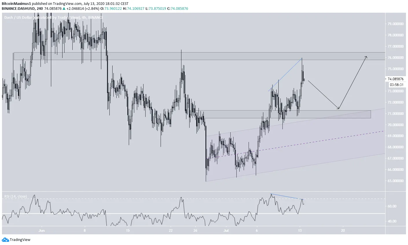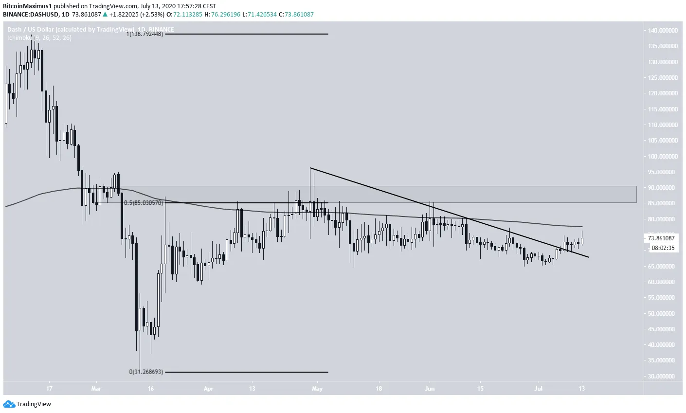 Od momentu osiągnięcia szczytu 29 kwietnia i zatwierdzenia obszaru 90 dolarów jako oporu, cena DASH podąża za opadającą linią oporu. Cena wybiła się z tej linii 7 lipca i od tego czasu rośnie.