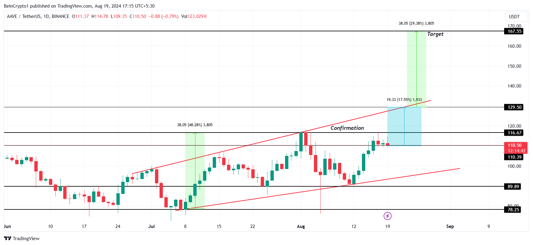 SponsoredSzanse na to są duże, ponieważ dynamika wzrostowa znacznie się zwiększyła. Po przełamaniu 116 USD, AAVE może osiągnąć 129 USD – czyli punkt wybicia. Wybicie z tego poziomu doprowadzi AAVE o 29% do 167 USD.