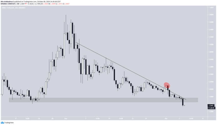 SRM spada od dnia 1 września, kiedy cena osiągnęła maksimum na 3,79 USD. Przez cały spadek cena podążała za opadającą linią oporu, z której rzekomo wyrwała się w dniu 30 września.