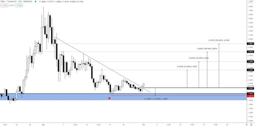 Kryptowalutowy trader @TheEuroSniper stwierdził, że przyjął dla SRM długą pozycję w oczekiwaniu na wzrost, obierając cele w wysokości 2,25, 2,45 i 2,70 USD na kolejny ruch w górę.