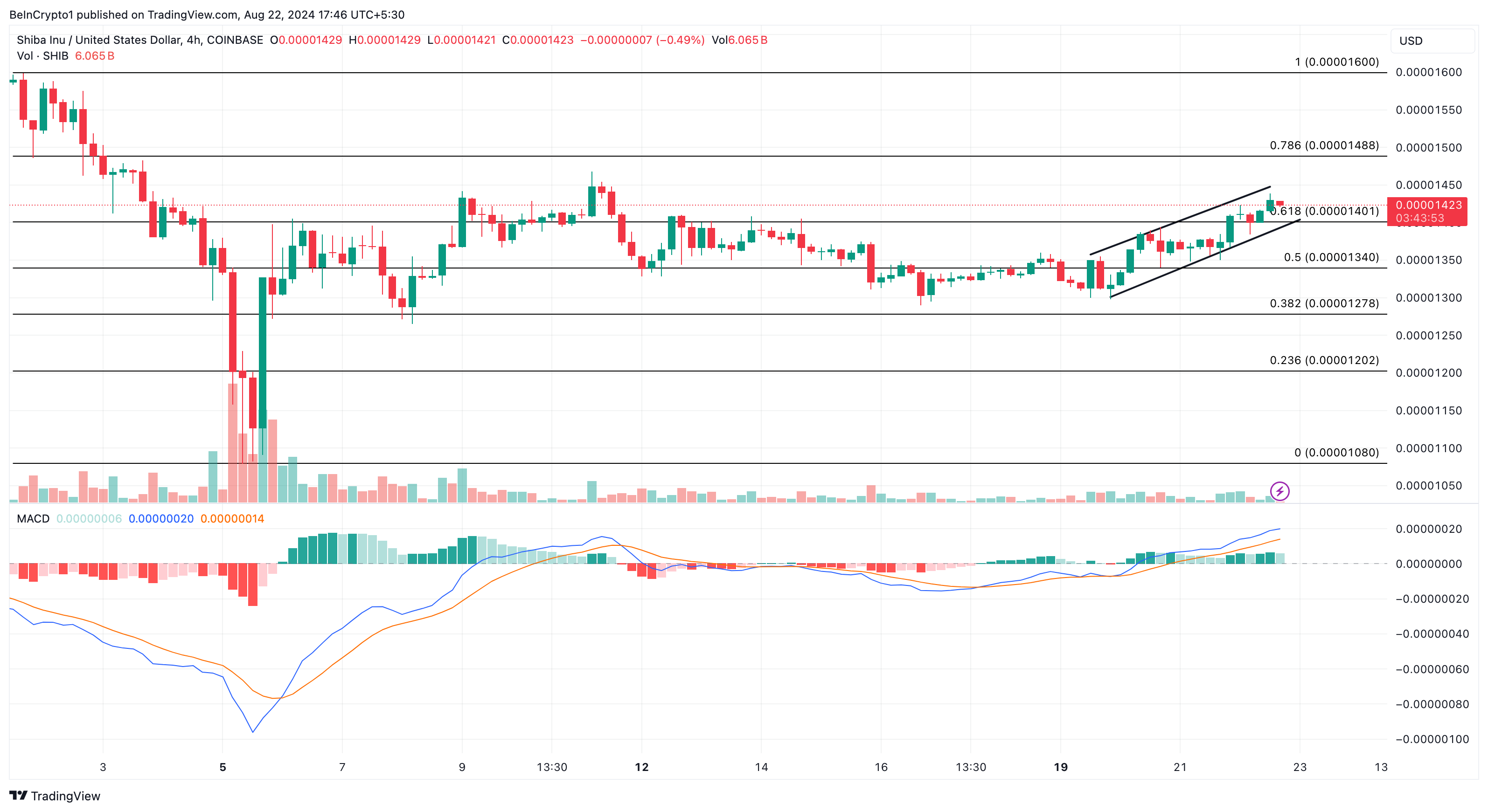 Na wykresie 4-godzinnym SHIB znajduje się w rosnącym kanale, znanym również jako „kanał wzrostowy”. Ten byczy wzorzec pojawia się, gdy tworzą się dwie rosnące, równoległe linie trendu. Wskazują one na konsekwentne zainteresowanie kupujących. Dolna linia trendu reprezentuje rosnące wsparcie, podczas gdy górna linia pokazuje opór. Jeśli ten wzór się utrzyma, cena SHIB może dalej rosnąć.