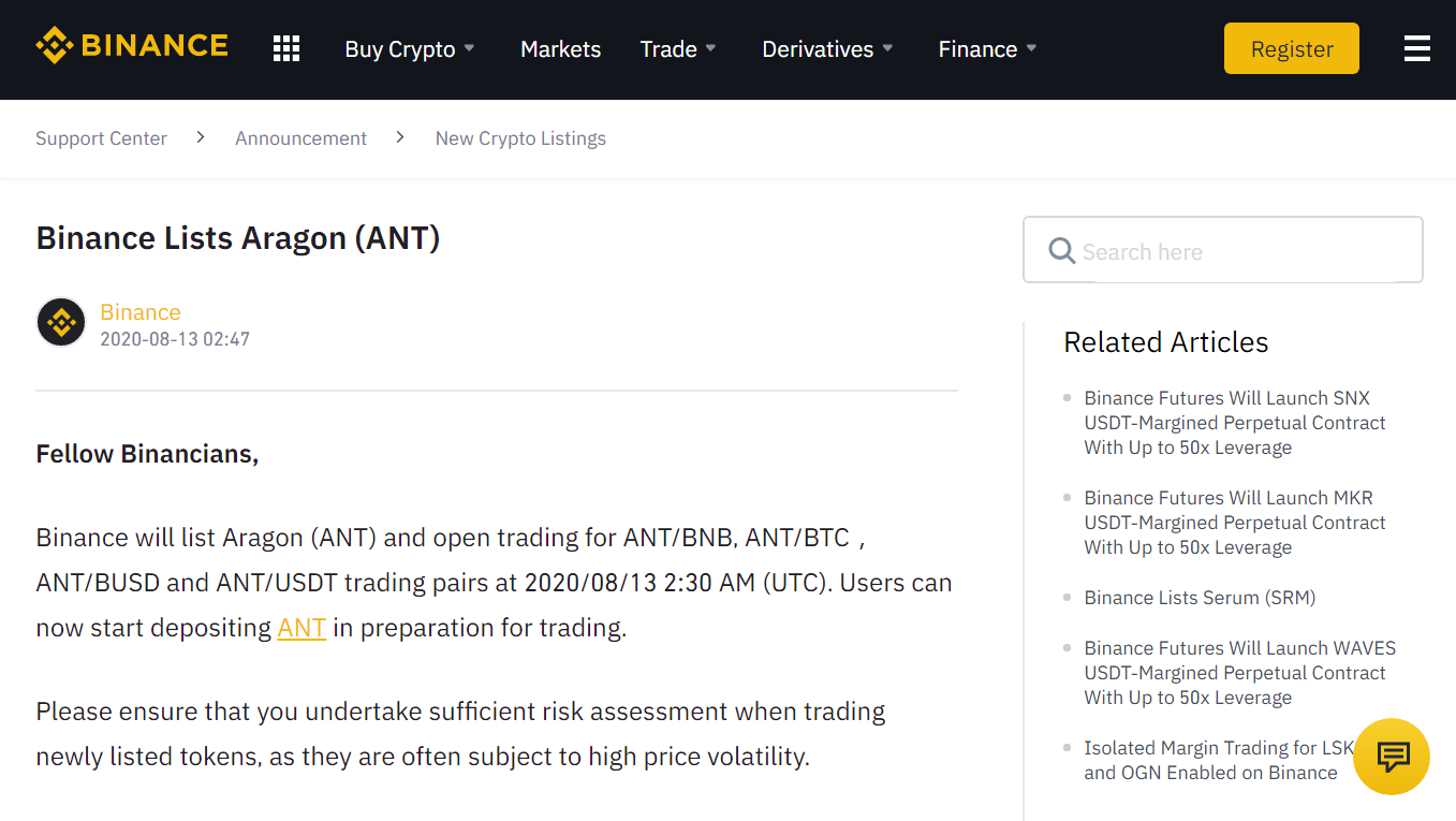 Sponsored SponsoredAragon (ANT) gets listed on Binance, OKEx and Huobi on August 13. Three exchanges announced listing of $ANT almost simultaneously. ANT is 300% up during last 14 days. pic.twitter.com/05cfxou27x