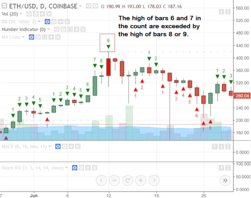 Ten wskaźnik obejmuje dziewięć kroków, jak wspomniano na stronie internetowej. Ale aby to ułatwić, Hackernoon sugeruje skupienie się na kilku głównych punktach. Pierwszym z nich jest szukanie wzoru dziewięciu świec, gdzie każde zamknięcie ma wyższą lub niższą wartość niż czwarta wartość względna poprzedniej świecy.