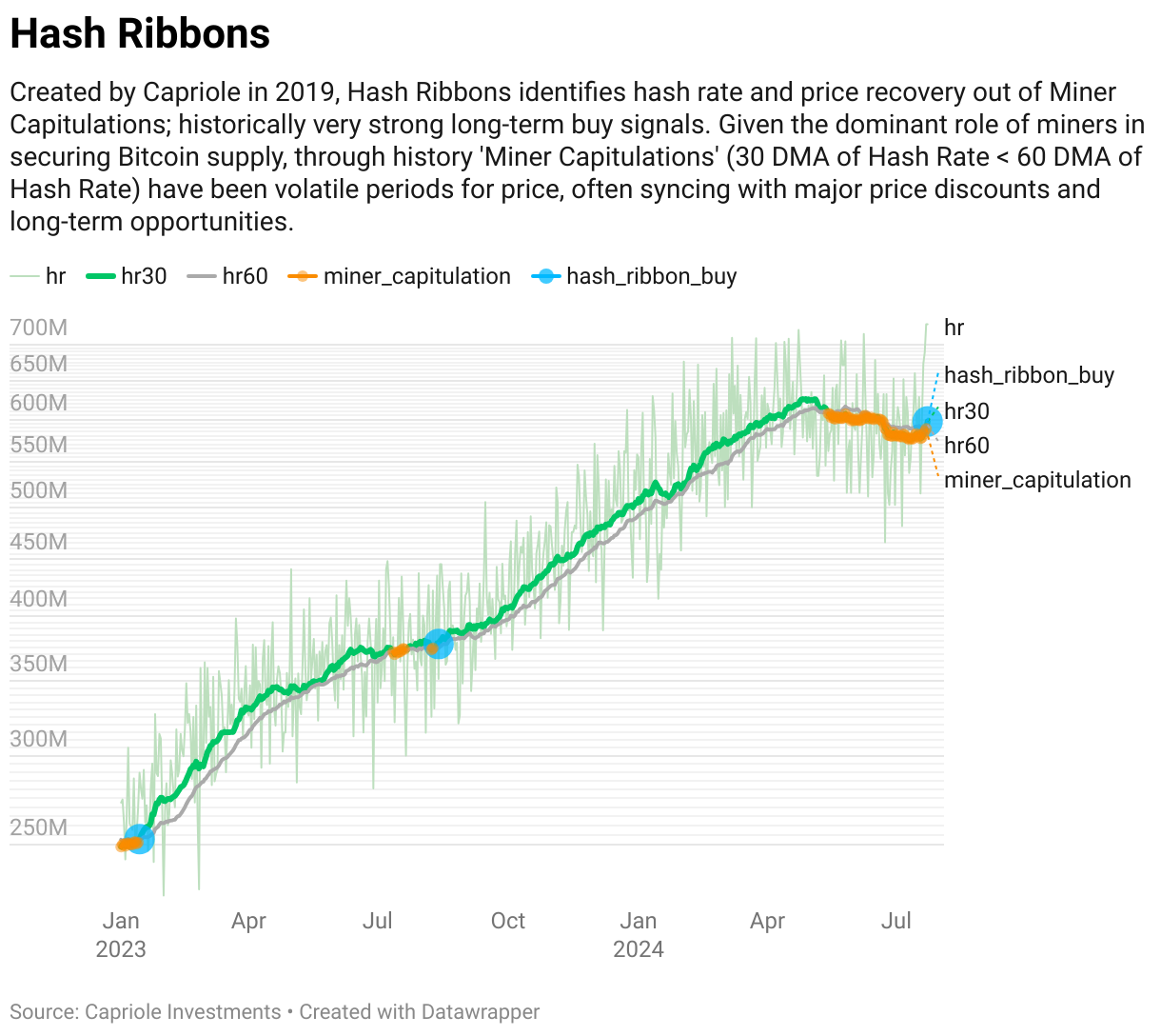 SponsoredSposób działania hash ribbon jest następujący: gdy 30-dniowa średnia krocząca hash ribbon spada poniżej 60-dniowej średniej, oznacza to, że górnicy zmagają się z trudnościami i mogą sprzedawać więcej Bitcoinów.