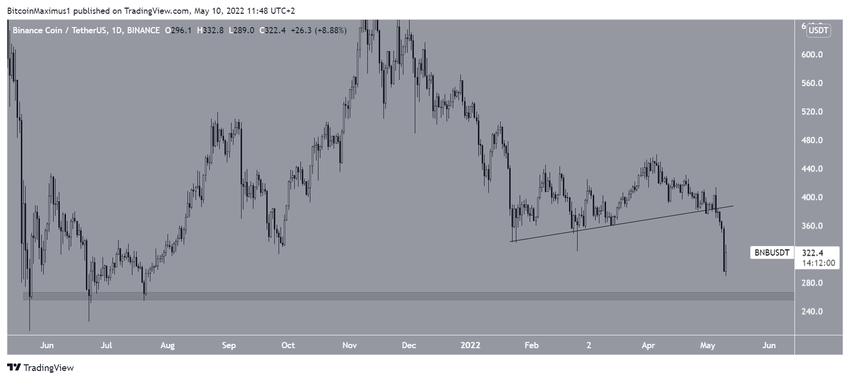 Binance Coin wzrastała wzdłuż wznoszącej się linii wsparcia od dnia 21 stycznia. Jednakże, nie udało się utrzymać ruchu wzrostowego i 5 maja nastąpiło załamanie z linii wsparcia. Do tej pory kurs osiągnął dołek na poziomie 289 USD w dniu 10 maja.