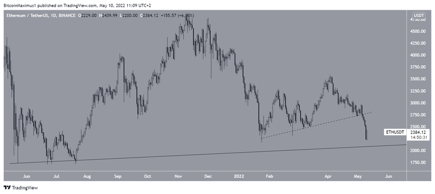 Od 21 stycznia Ethereum rosło wzdłuż krótkoterminowej wznoszącej się linii wsparcia (przerywana). W dniu 5 maja kurs w końcu się z niej załamał i 10 maja osiągnął dołek na poziomie 2200 USD. Dołek ten znajdował się nieco powyżej rocznego dołka na poziomie 2170 USD.