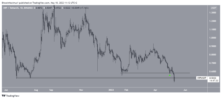 Od dnia 22 stycznia XRP handlował powyżej obszaru wsparcia na 0,58 USD. Chociaż 30 kwietnia odbił się od tego obszaru (zielona ikona), od tego czasu spadł poniżej niego.