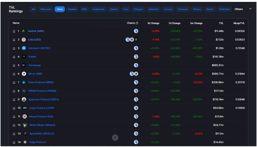 Terra (LUNA) z całkowitą blokadą wartości (TVL) pokonała popularne sieci blockchain oparte na inteligentnych kontraktach, takie jak Binance Smart Chain, Fantom, Avalanche i Solana .