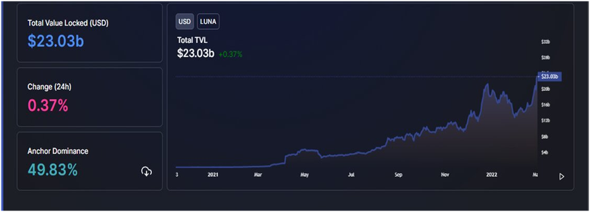 Wraz z rosnącym zapotrzebowaniem na usługi DeFi, Terra Network przekroczyła na początku marca ponad 22 miliardy USD całkowitej wartości zablokowanej (TVL).
