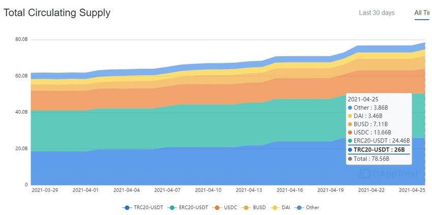 Jest to charakterystyczne dla ogólnego wzrostu stablecoinów. Tylko w ciągu ostatnich 30 dni stablecoiny, w tym Tether, wzrosły o prawie 30%, z 61 miliardów dolarów do 78 miliardów dolarów.