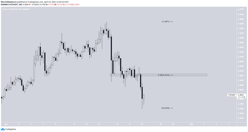 W dniu 17 kwietnia XTZ osiągnął nowy rekord wszech czasów (ATH) na poziomie 7,67 USD. Jednak wkrótce potem spadł, tworząc niedźwiedzią świece doji. Konsekwencją była duża, niedźwiedzia świeca, która cofnęła altcoina z powrotem do obszaru wsparcia na 4,50 USD.