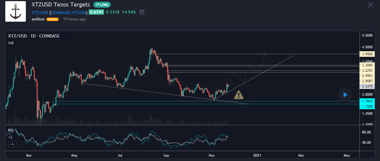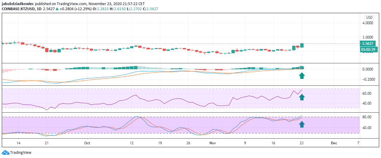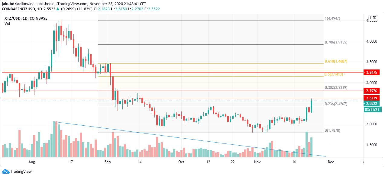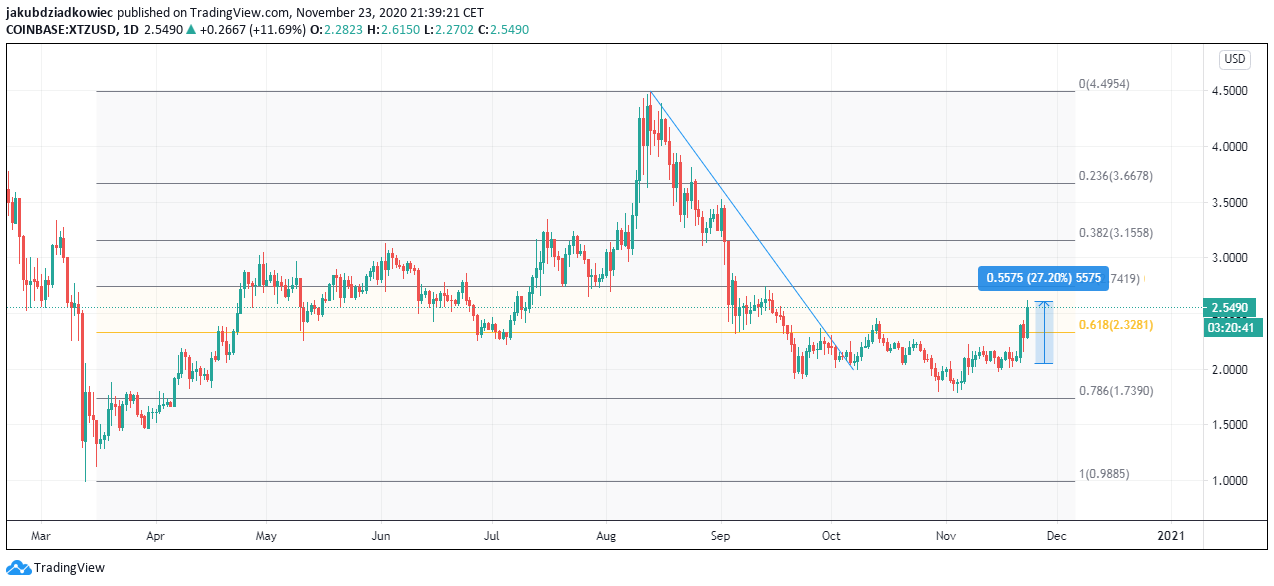 Od tamtej pory cena rośnie, a w dniu 21 listopada przebiła długoterminowy opór na 2,33 USD, następnie potwierdziła go jako wsparcie i kontynuuje ruch w górę. W trakcie ostatnich trzech dni gwałtowne wybicie doprowadziło Tezos do 27-procentowego wzrostu ceny.