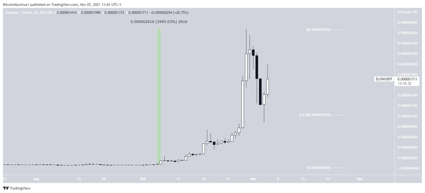 ELON doświadczył ogromnego wzrostu, który rozpoczął się 6 października. Doprowadziło to do nowego ATH na poziomie 0,0000026 USD w dniu 31 października. Oznaczało to wzrost o 3945% w mniej niż jeden miesiąc.