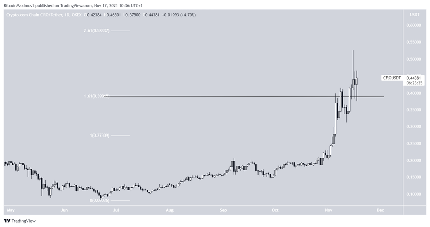 Crypto.com (CRO) rośnie od 29 września. W dniu 15 listopada moneta osiągnęła nowy ATH na poziomie 0,526 USD. Pomimo następującego później spadku, nadal utrzymuje się powyżej poziomu oporu przy zewnętrznym zniesieniu 1,61 Fib przy 0,39 USD. Obszar ten wcześniej działał jako opór, a teraz oczekuje się, że będzie działał jako wsparcie.
